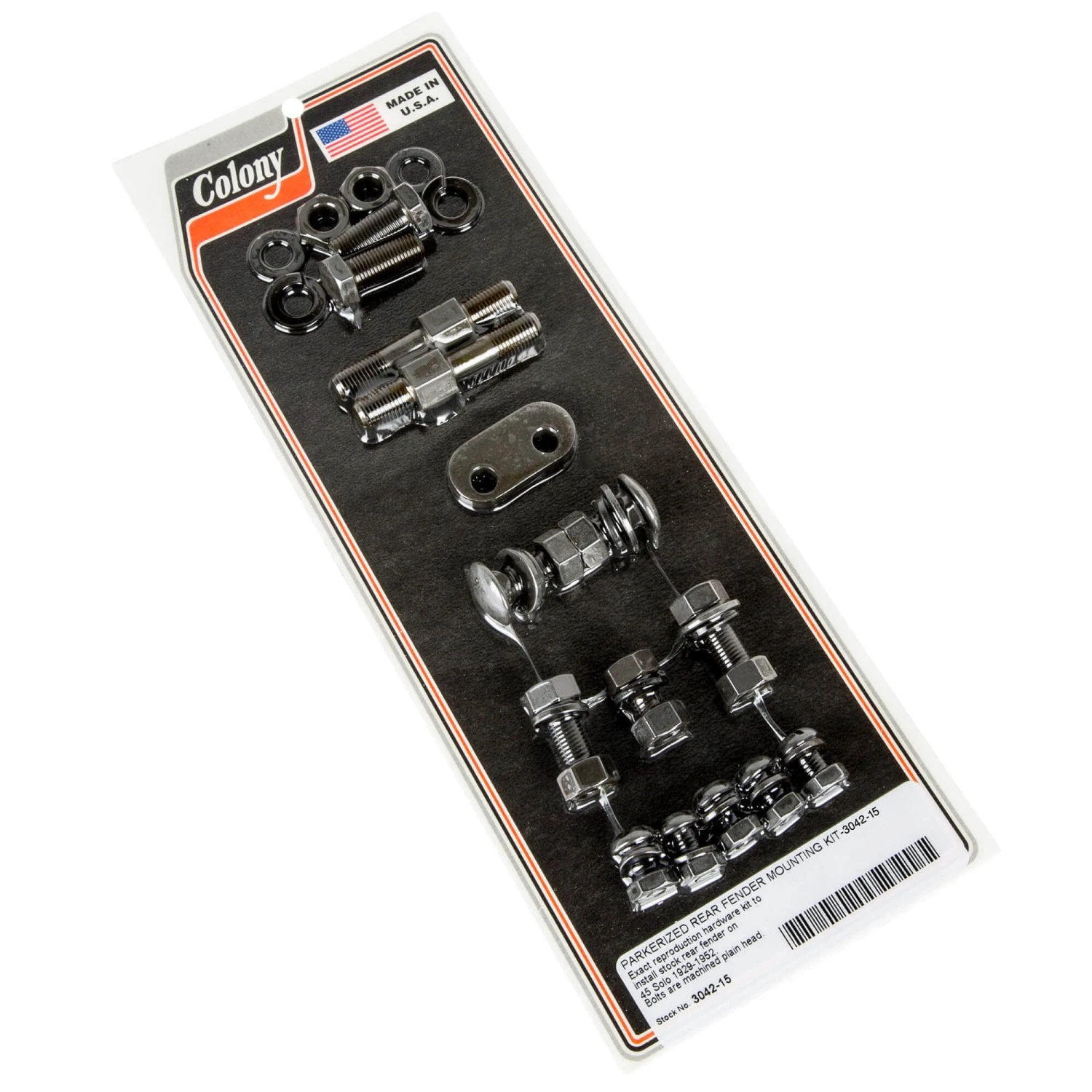 PARKERIZED REAR FENDER MOUNTING KIT Exact reproduction hardware kit to install stock rear fender on 45 Solo 1929-1952. Bolts are machined plain head.