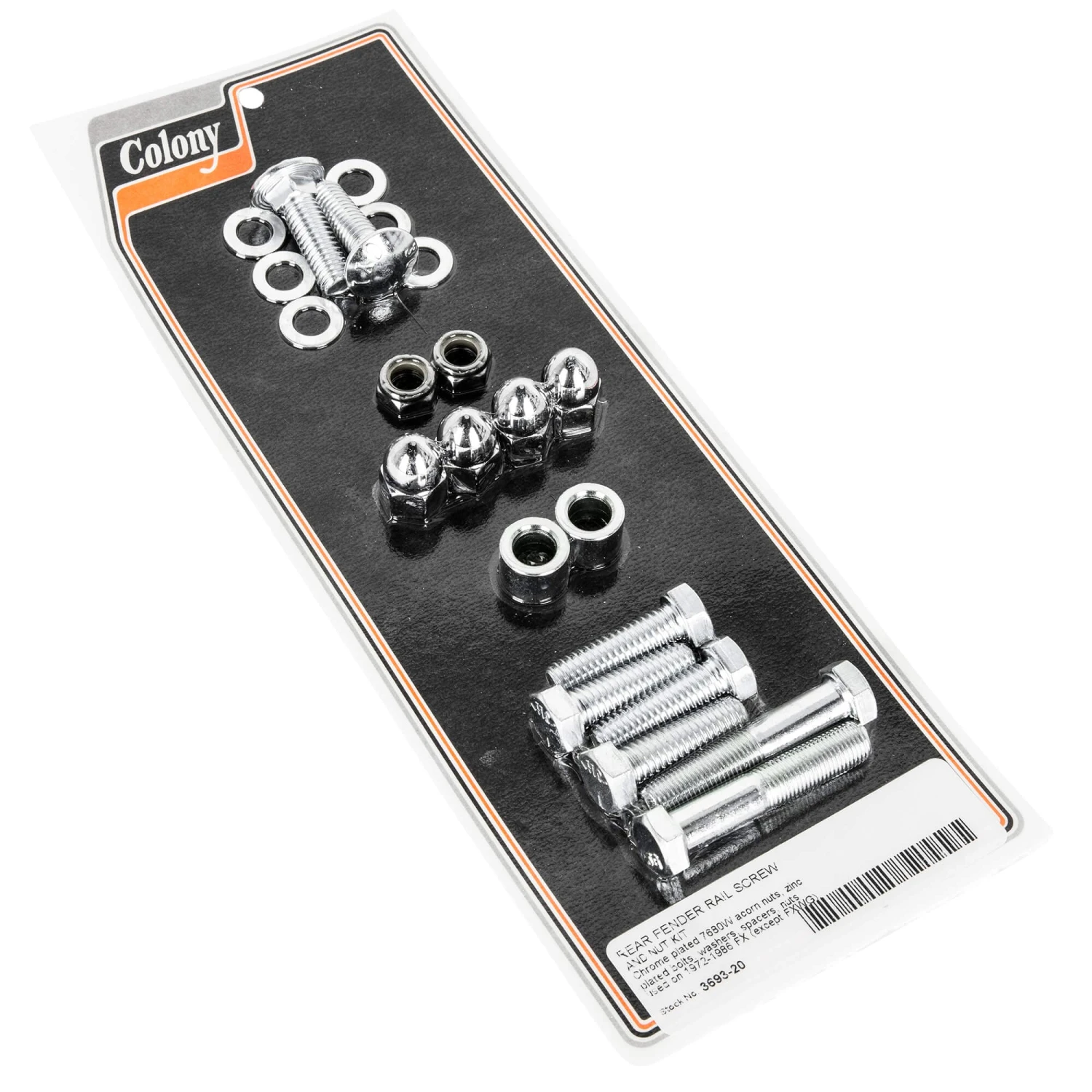 Colony Machine #3693-20 Rear Fender Rail Screw Kit 1972-86 Harley-Davidson FX. Chrome plated 7680W acorn nuts, zinc plated bolts, washers, spacers, nuts used on 1972-1986 FX (except FXWG). Made in Ohio, USA.