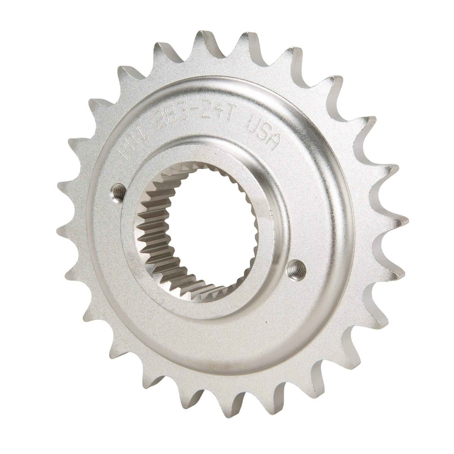 This kit is designed to match stock gearing for 1994 – 1999 Dynas. The countershaft (front) sprocket is 24 teeth, and the rear sprocket is 52 teeth, for a 2.166:1 gearing ratio. This means that the countershaft sprocket rotates 2.166 times to spin the rear sprocket one full revolution. The less times the countershaft sprocket has to rotate, the taller the gearing, meaning less power off the line but better high-speed cruising. The rear sprocket has a 2.214 inch diameter center hole to fit the included wheel spacer which engages to the stock rear hub, which typically accepts a 1.985″ center hole sprocket or pulley.