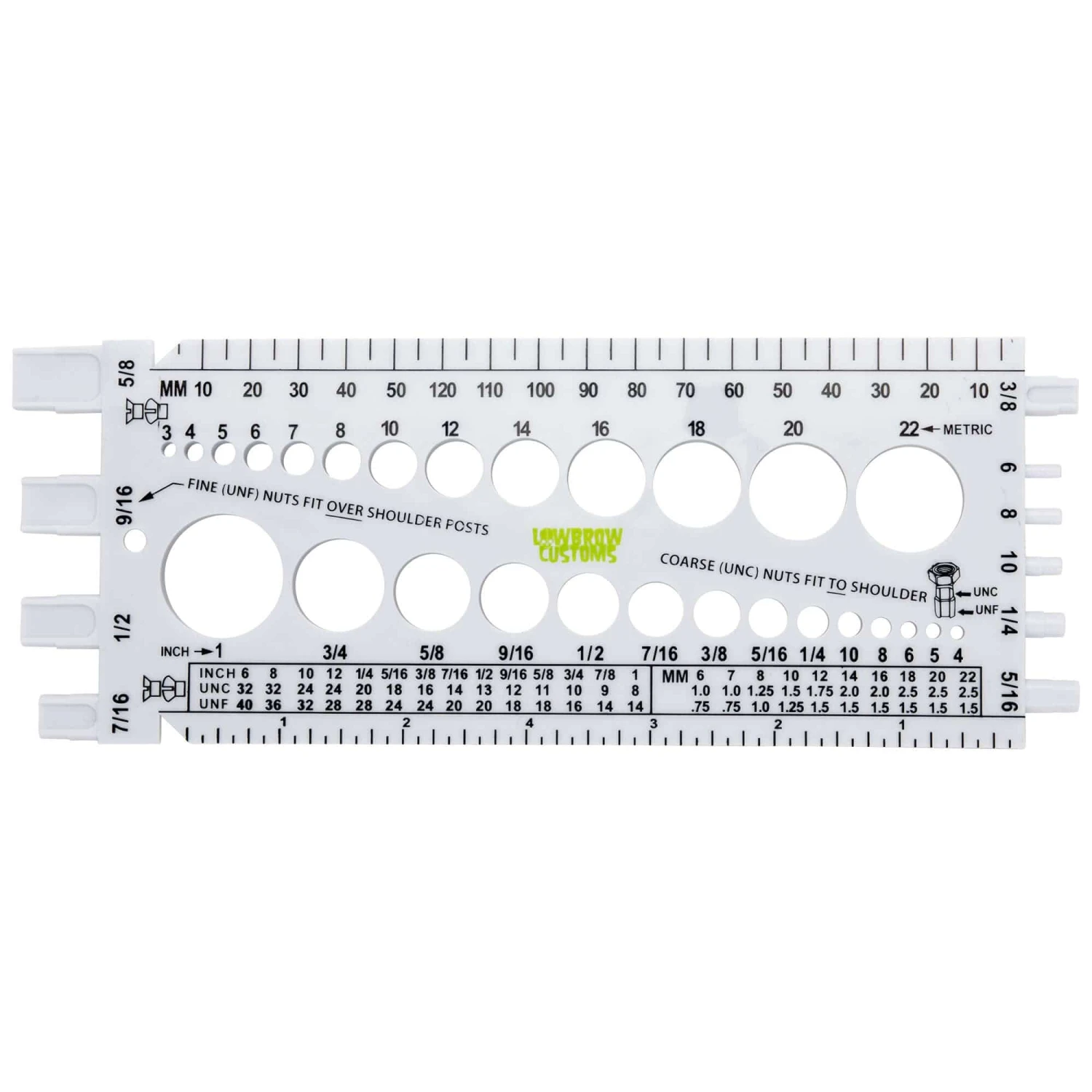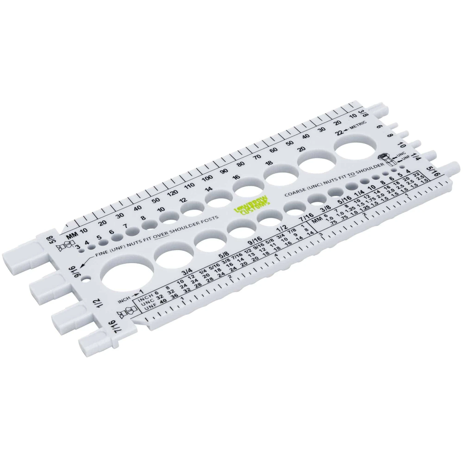 A must-have for any garage or workshop, this bolt size gauge is excellent for sizing bolts, screws, nuts (USS, SAE and Metric), washers (USS, SAE) and twist drills. A unique feature of this tool is that it has both US and Metric thread pitch injection-molded right into it! Simply hold up the threads of your bolt and quickly and accurately check the thread pitch (without having to go to the hardware store or trial-and-error thread different nuts onto the bolt in question). This reliable and accurate tool resists water, alcohol, oil and grease. It measures 8-5/8 inches by 3-1/4 inches, compact enough to slip in your pocket.