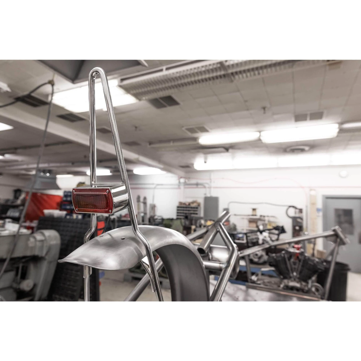 Set up for a variety of fenders and tail light combinations right out of the box, and beautifully chromed. This sissy bar is designed specifically for use with 16″ rear wheels.