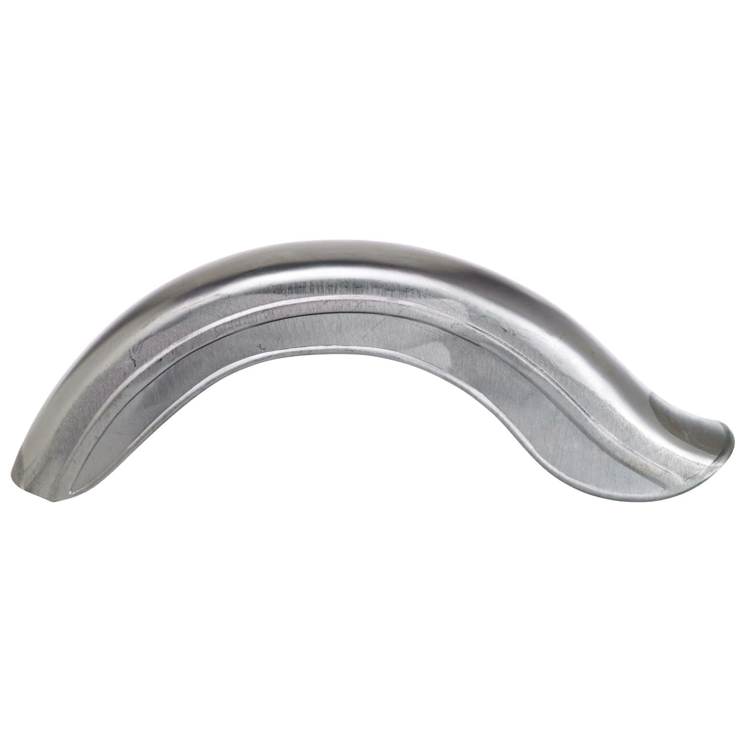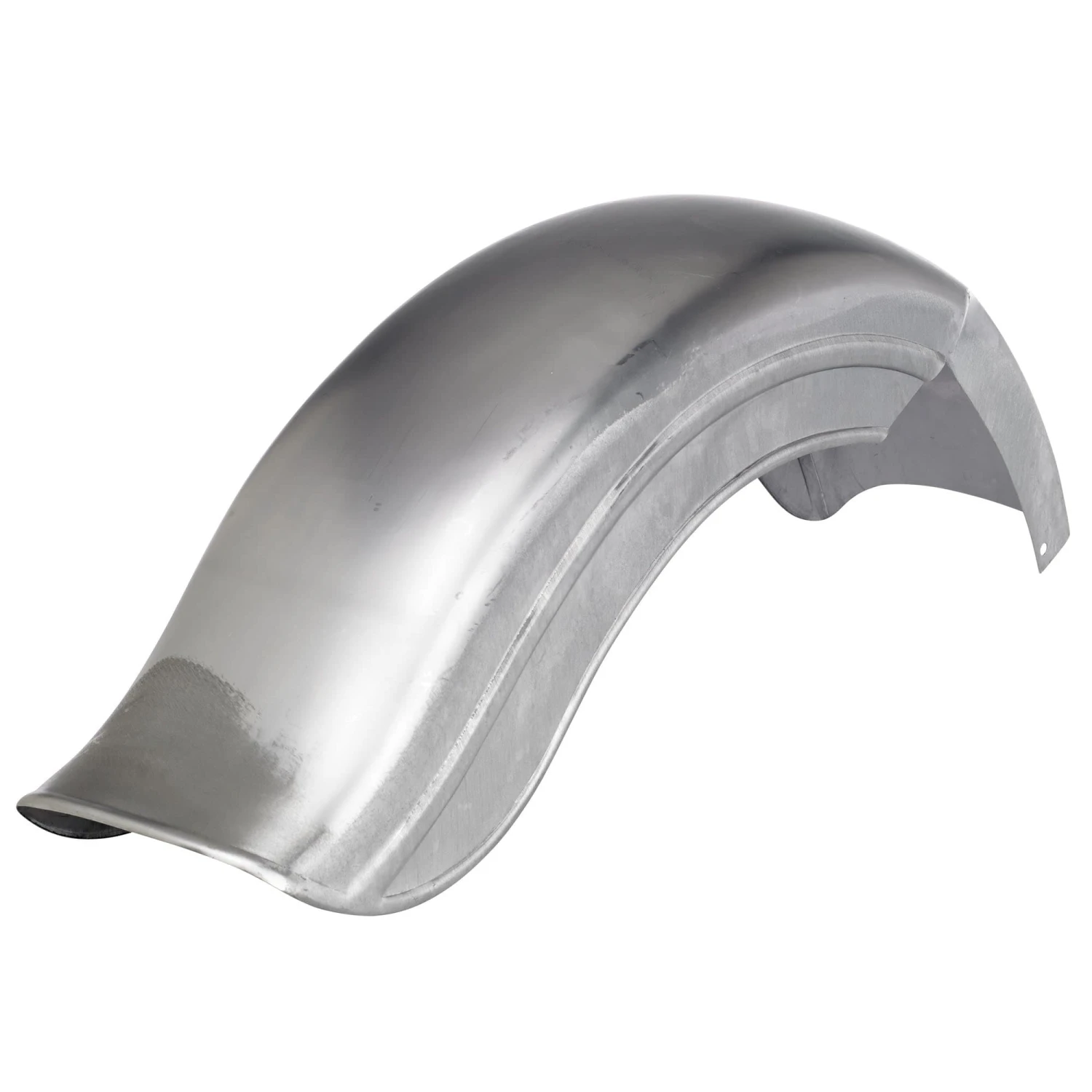 These bare steel fat bob fenders have a chain relief on the right side and can be run on any right side drive motorcycle like Triumphs, Yamaha XS650, Harley Davidsons, etc. These are really sturdy, heavy duty fenders. Run the whole thing or modify it, section and narrow it, use only the end ‘flip’ for that bratty look or whatever you want to do. 7″ wide, 28″ measured straight across end to end and 38″ measured along the curve of the fender. These are a proper radius for an 18″ rear rim, or a 16″ rear with a high sidewall vintage style tire. This fender features a Right side chain relief (Right side when sitting on the motorcycle facing forward).