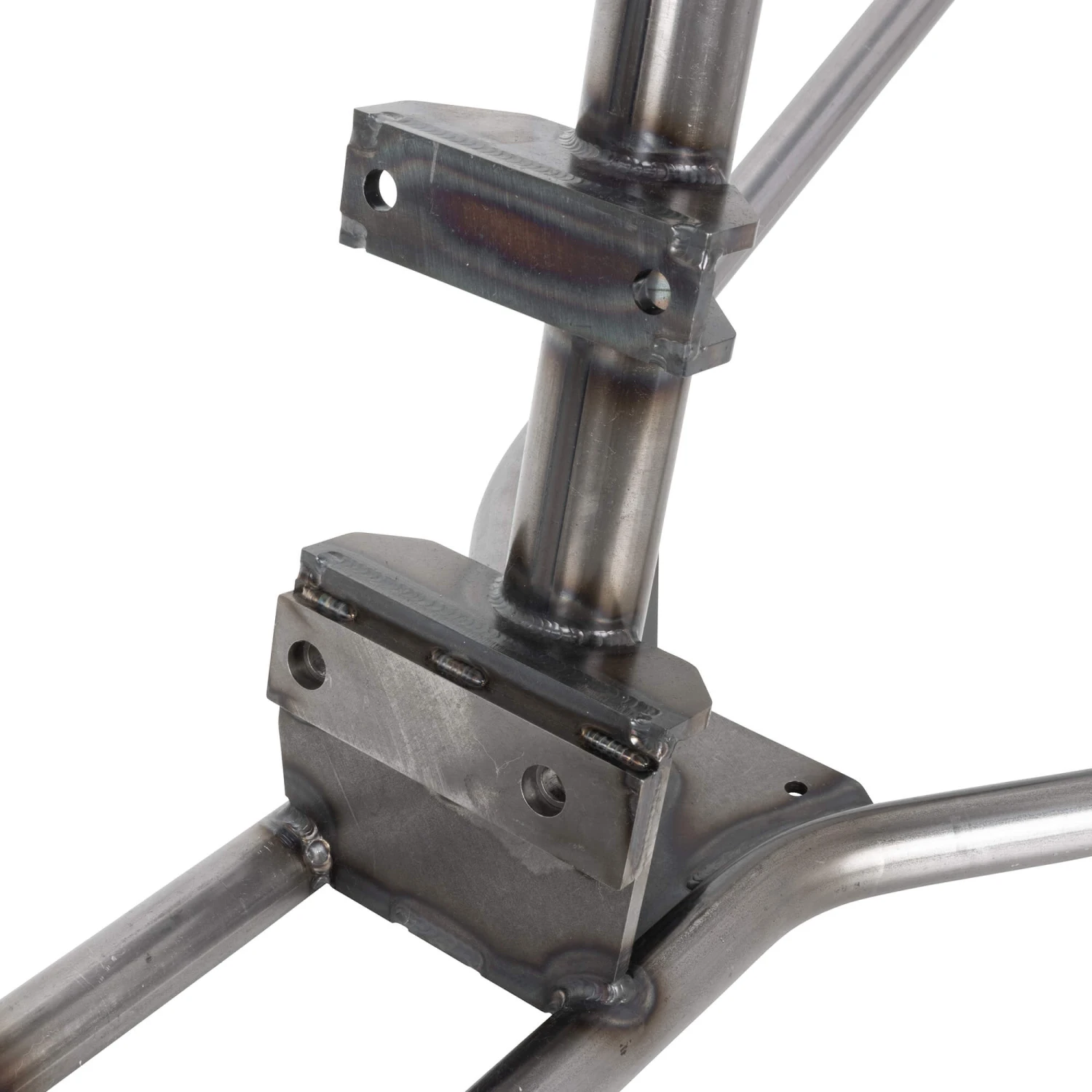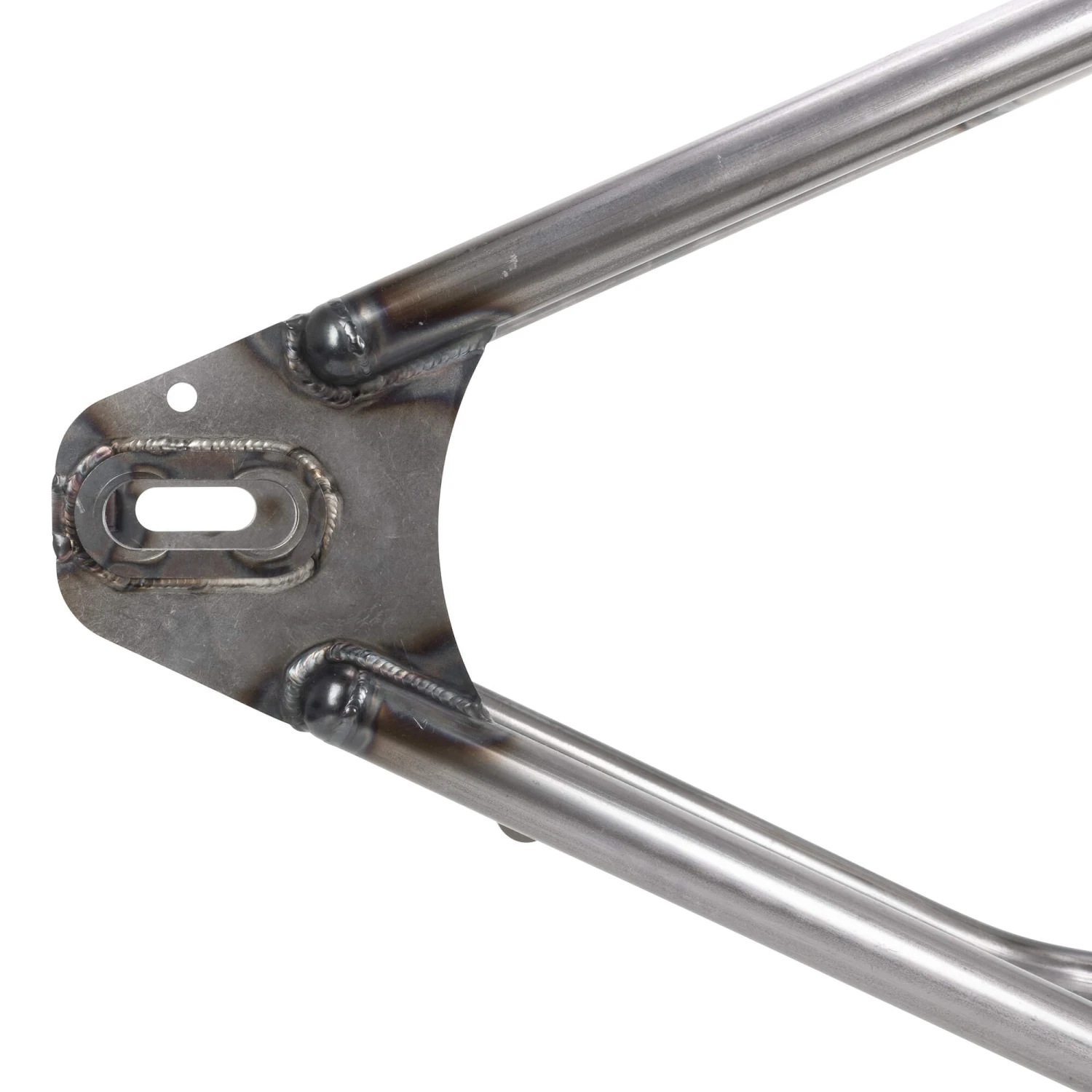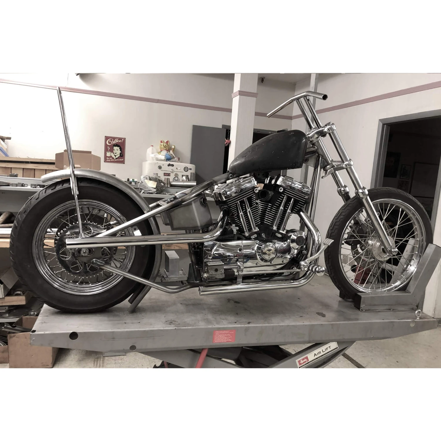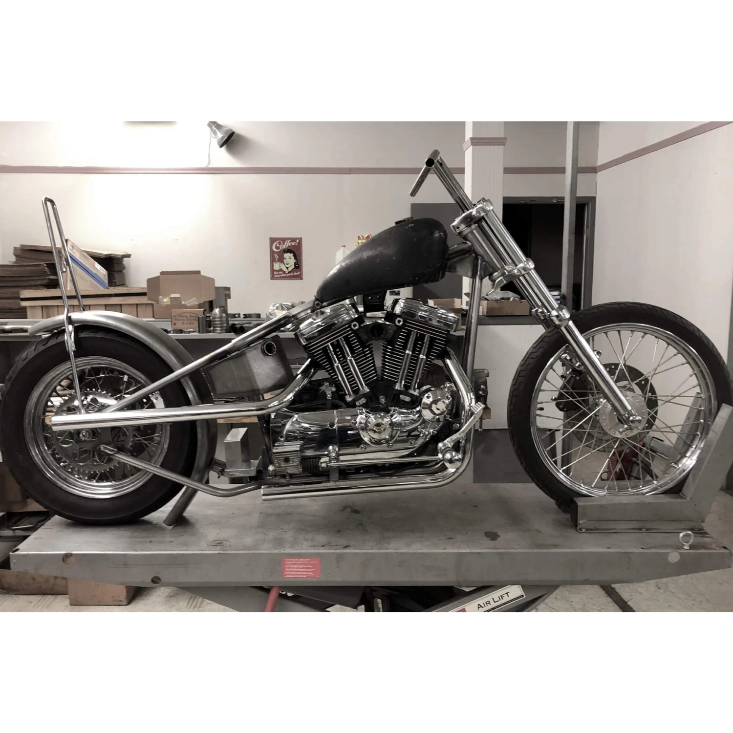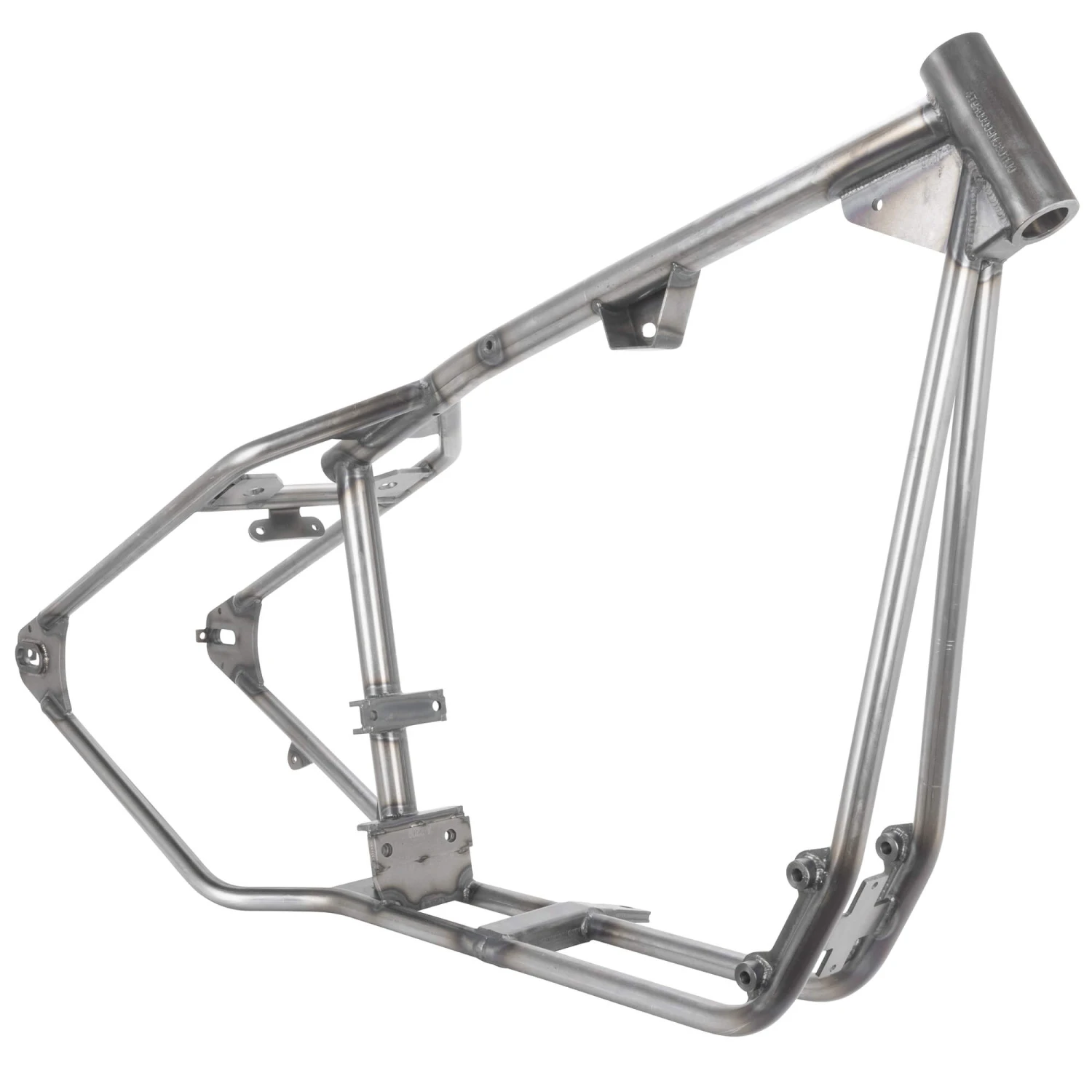 The neck has a 32 degree rake and is in the stock location, this frame has no ‘up’ or ‘out’ dimension to the neck, is set up for a 1″ stem, and utilizes 1″ stem Timken style neck cups. This stem size is very common and is found on narrow glide front ends on Sportsters 1982 and later, and on Harley Big Twin front ends, including narrow glide, wide glide, OEM and most aftermarket springer front ends.