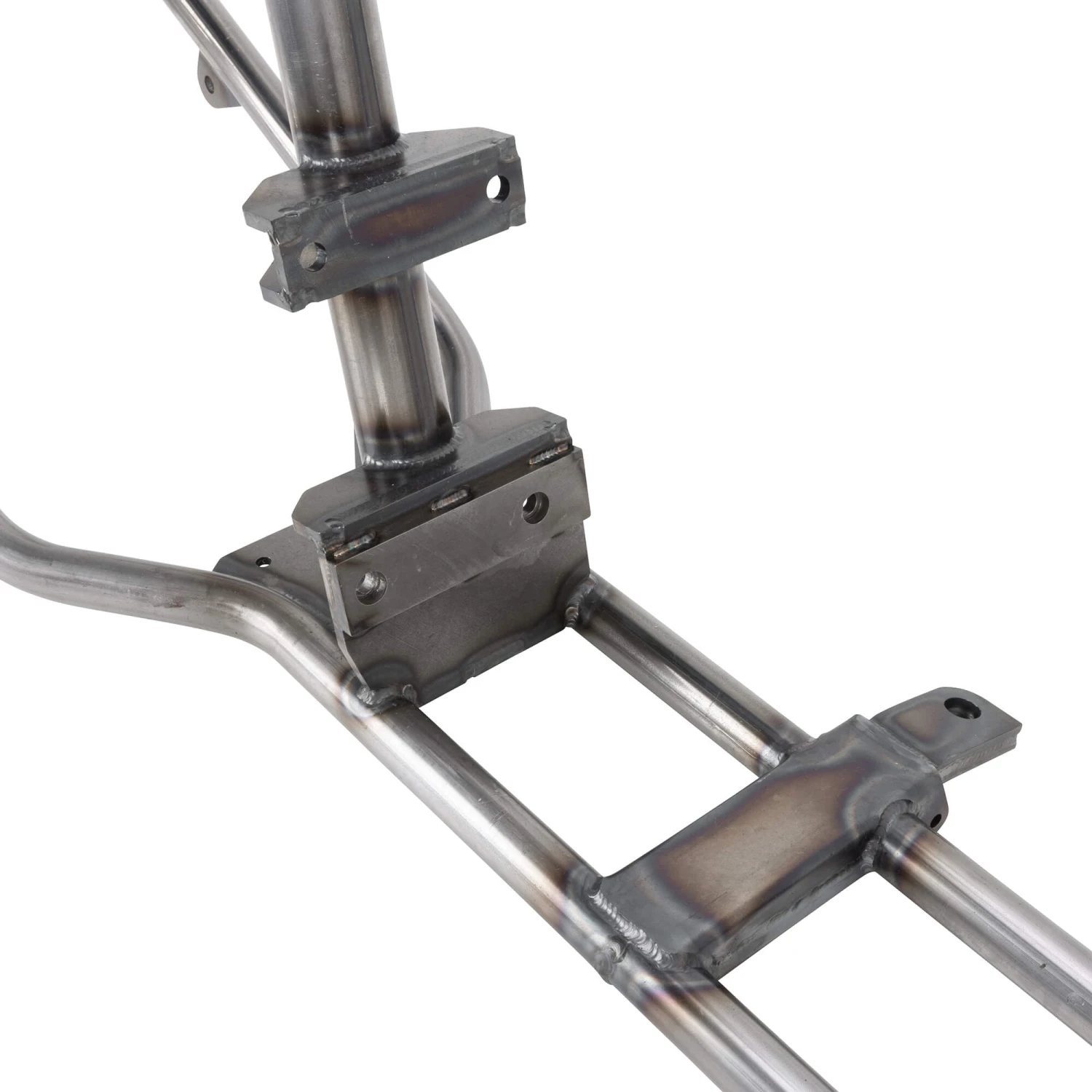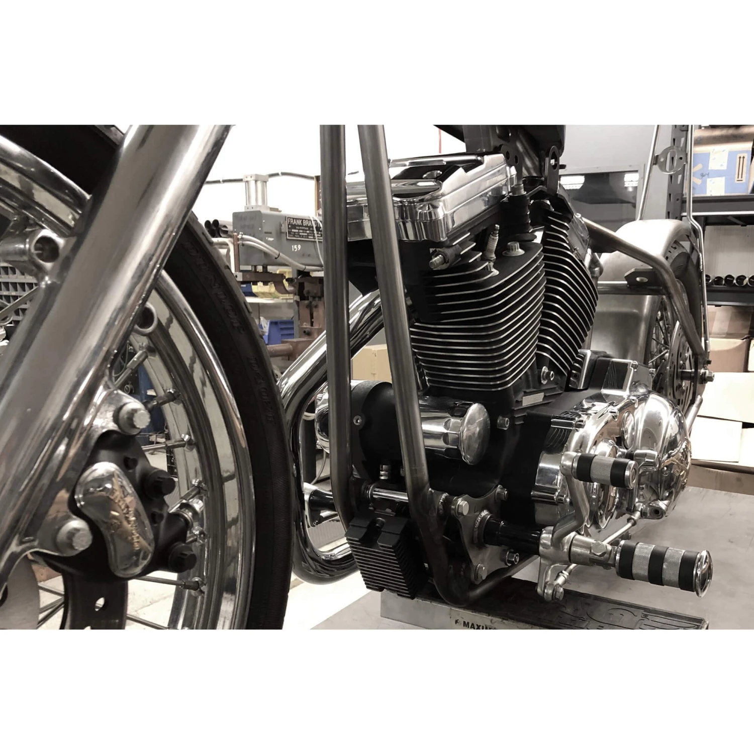 Unlike other custom frames, the Gasbox full rigid frame uses stock motor mounts all around, with the engine cradled low in the frame rails just like a stock bike. This looks much cleaner and keeps the finished chopper looking lean and handling better with a lower center of gravity. The frame will require use of early style front motor plates (