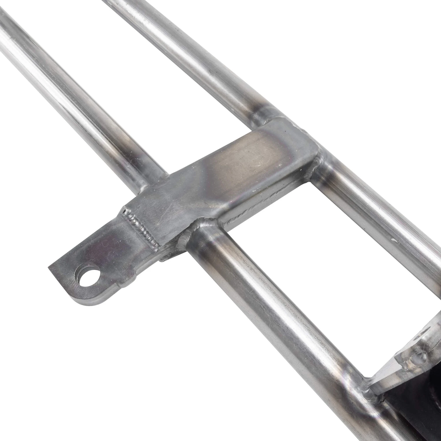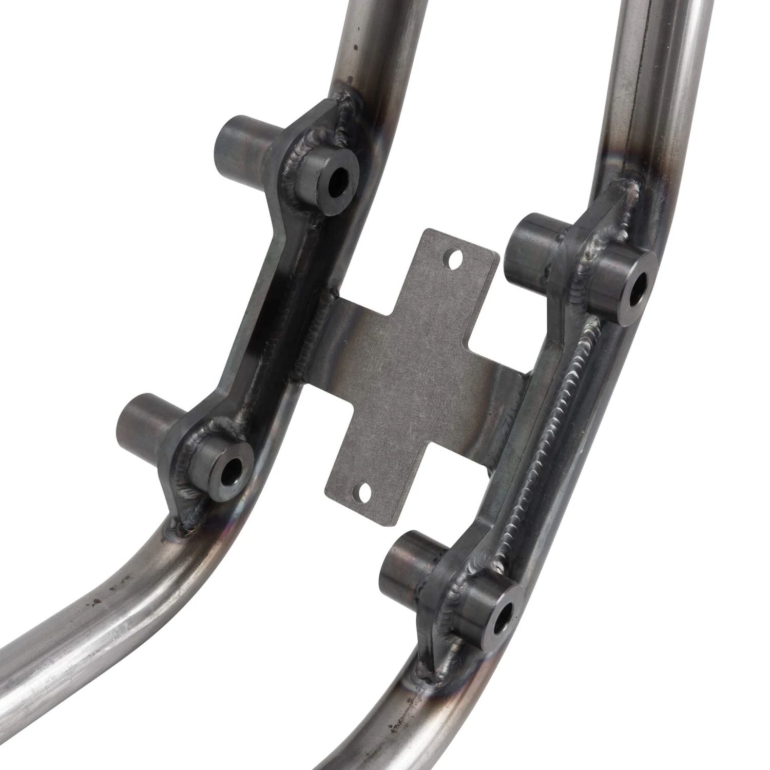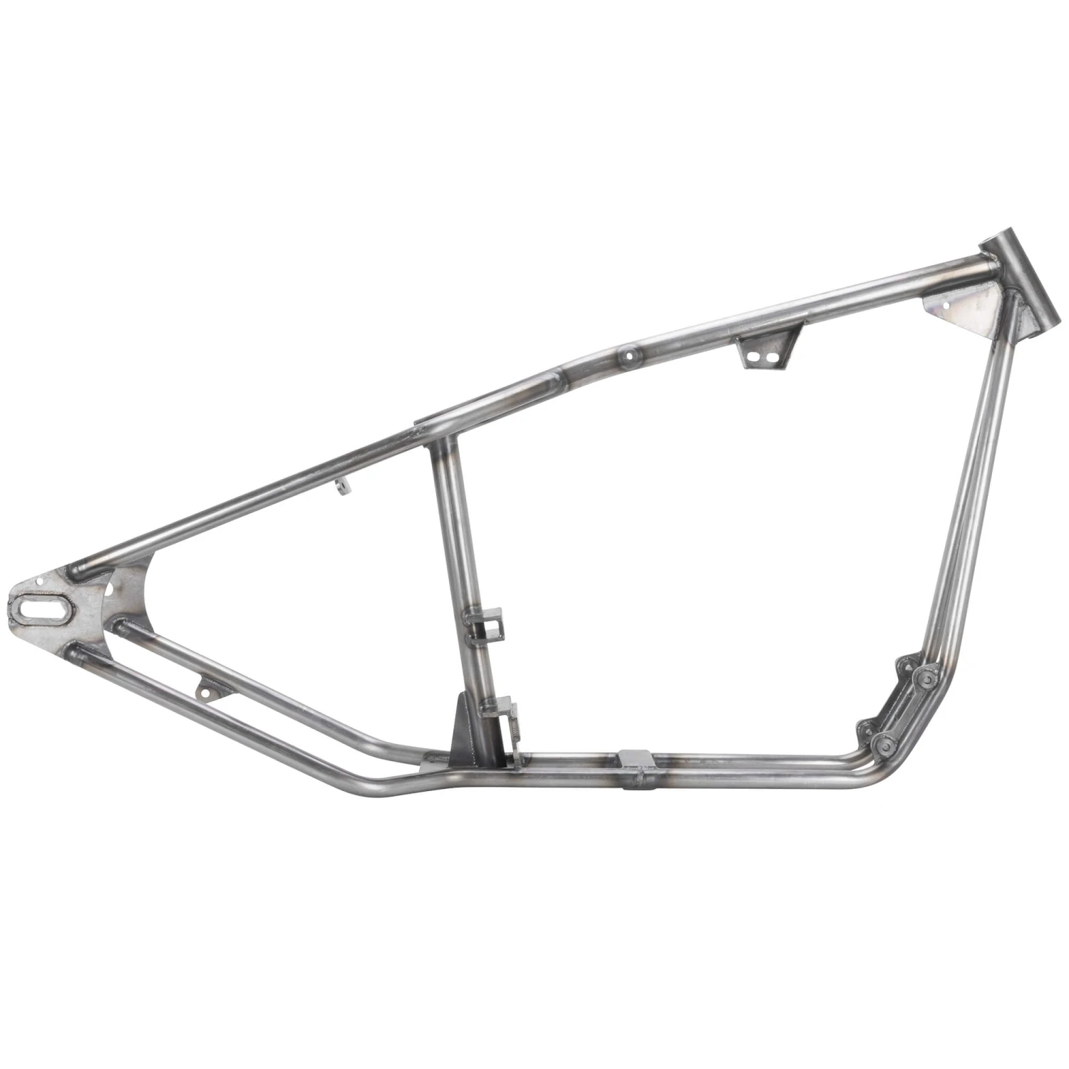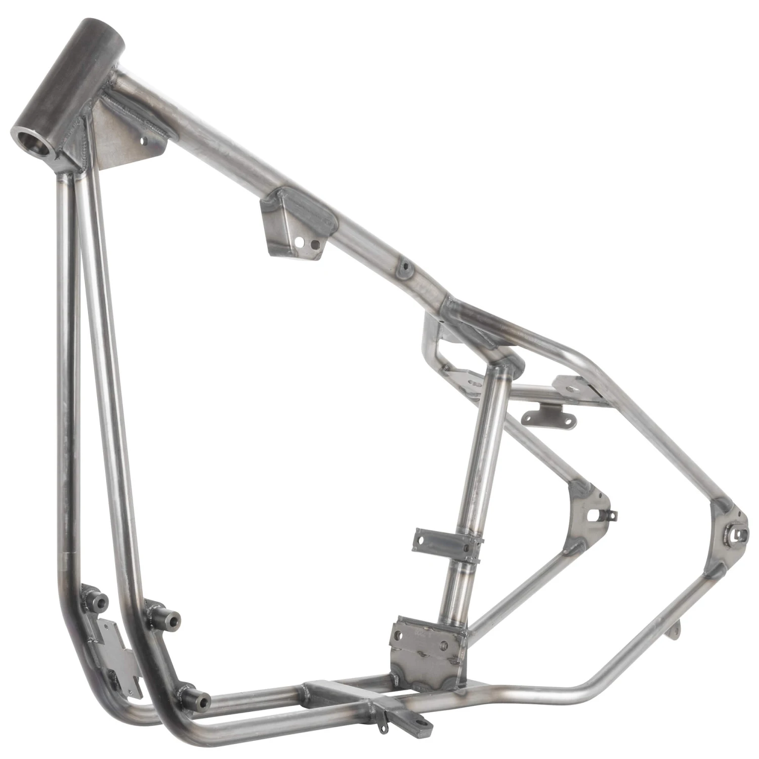 has approximately 4 inches of stretch and is set up to have 2 inches of drop. This means that with a front end and wheels on the bike the lower frame rails sit 2 inches closer to the ground than stock for that perfect stance. The axle plates are set up for a standard 3/4 inch rear axle and accepts a stock disc brake Sportster rear axle. This frame also features integrated upper mounts for