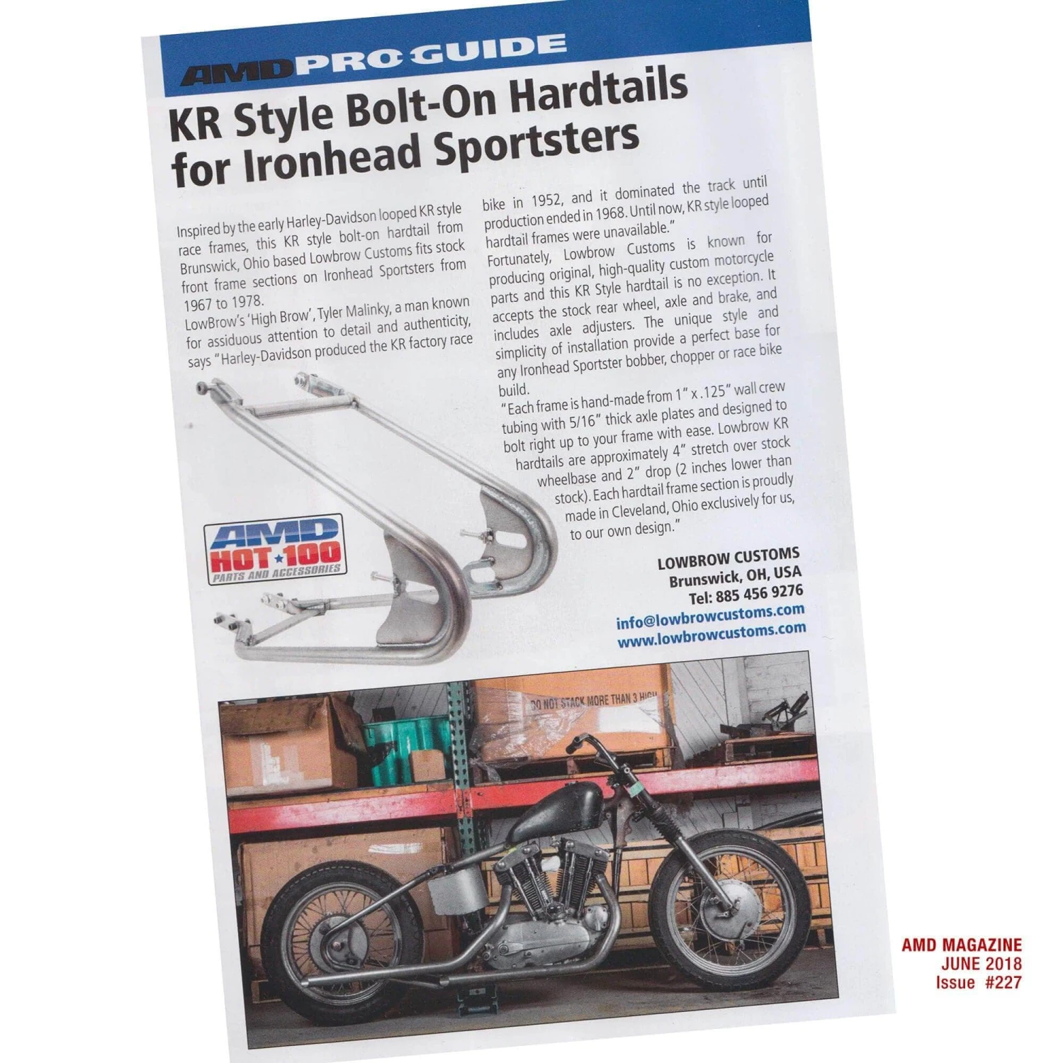 Accepts stock rear wheel, axle and brake. Includes axle adjusters. Lowbrow KR hardtails are approximately 4″ stretch over stock wheelbase and 2″ drop (2 inches lower than stock). Proudly made in Cleveland, Ohio, USA. These hardtails are in stock and ship immediately.