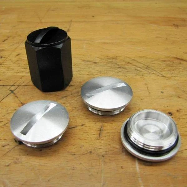 Set of 3 inspection caps and 1 install / removal tool. These billet aluminum slotted inspection caps fit Triumph and BSA motorcycles. They fit your primary inspection hole, gearbox filler hole and also the kicker cover inspection hole. Complete with O-ring seal. These stay true to your stock style covers and are made right here in Ohio, USA! The inspection cap tool is the perfect size and radius to install and remove your inspection caps without chewing them up, which is commonly done with a large screwdriver. Black oxide coated, with a 1″ hex so you can use a wrench or a socket and ratchet to install and remove your plugs with ease. Inspection caps replace Triumph OEM # 57-2166, 70-8231, 40-0715