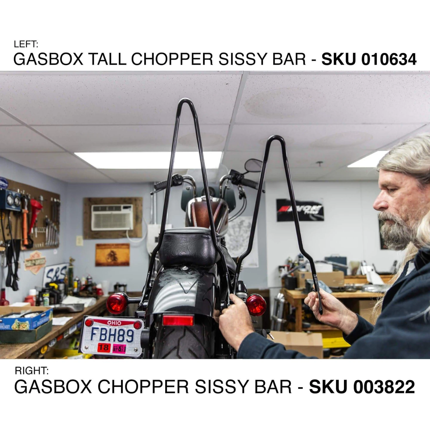 New from the Gasbox- “Chopper” Bolt On Sissy Bar for 2004 & Up Sportsters. This bolt on kit allows you to mount a sissy bar to your stock swingarm motorcycle. No more worrying about how to secure your gear! The tall version is 5″ taller than the standard model for a 24″ overall height.